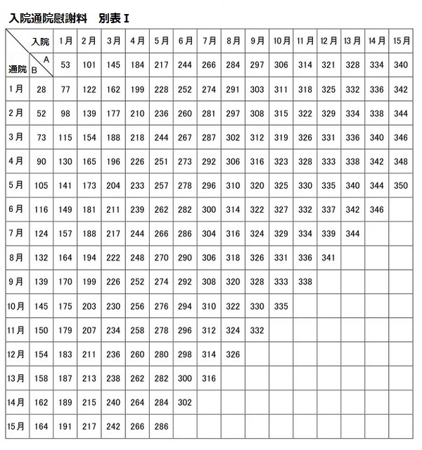 まず、入院通院の慰謝料を計算する際には、原則として、別表Ⅰの表を使います。