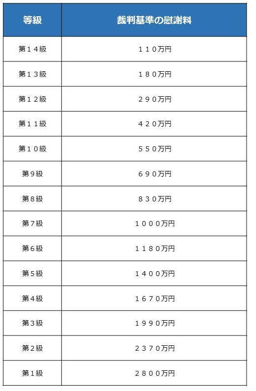 会社に対して請求する後遺障害慰謝料の相場は、次のとおり、認定された等級ごとの相場があります。