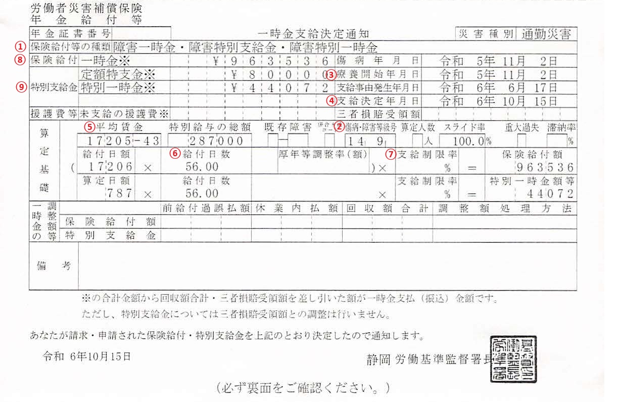労災の後遺障害が認定されると支給決定通知書が届きます。通知書の読み方について、重要な項目に絞って番号を振って、順番に解説します。